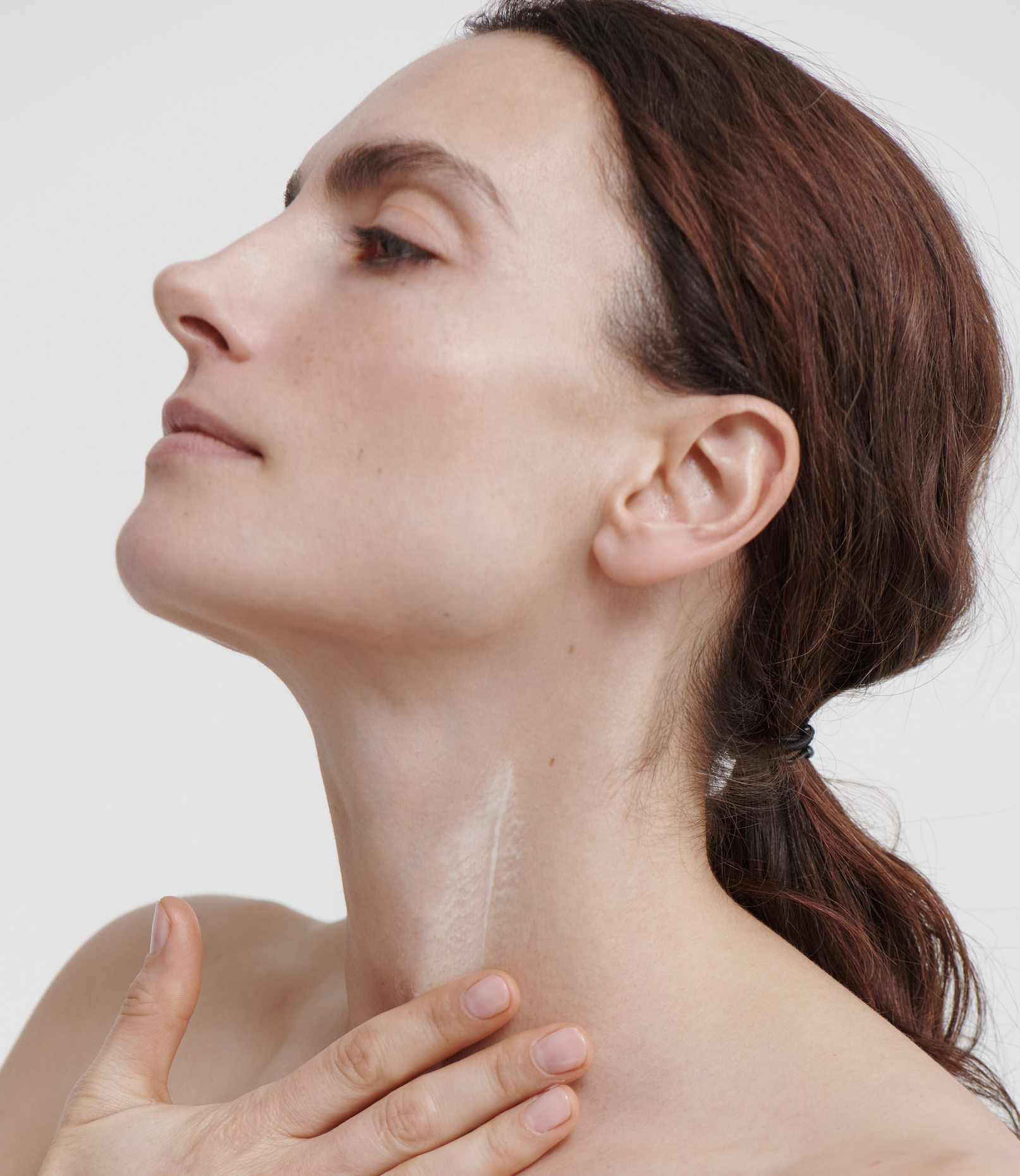 3) Warm around a large pea size Regenerating Neck and Décolleté Cream between the palms of your hands and apply to neck and décolleté - to protect, nourish, tone and firm